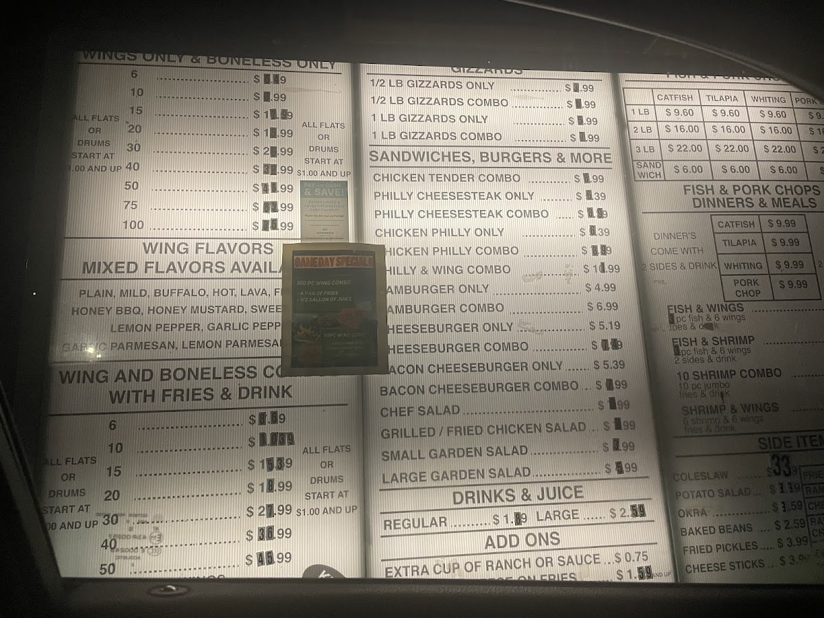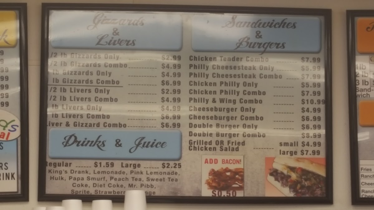 You’ll find a variety of wings featuring flavors from honey mustard and lemon pepper to spicy Cajun-ranch combinations. Alongside the wings, there are hearty sandwiches and burgers, fresh salads, and crispy fries that suit a relaxed, easygoing atmosphere. Seafood and pork chop dinners add a bit of variety, while smaller plates like chicken livers and gizzards provide a nostalgic touch for those who enjoy traditional Southern flavors.